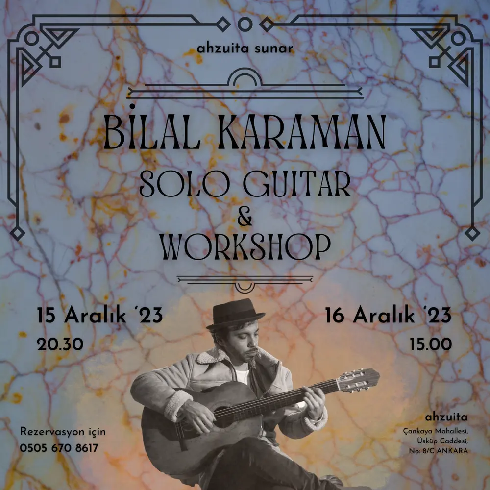 | Etkinlik Konusu | Bu hafta sonu salonda, müziğe çocuklukta başlamış kendi alanında oldukça başarılı bir gitaristi, sevgili Bilal Karaman'ı ağırlayacağız. 15 Aralık Cuma akşamı solo gitar performansıyla eski Türkçe parçaları, caz standartlarını ve klasikleşmiş gypsy repertuarını kendine has şekilde yorumlayacak olan Karaman, 16 Aralık Cumartesi öğlen 17:00'de gitar atölyesiyle bizlerle olacak. |