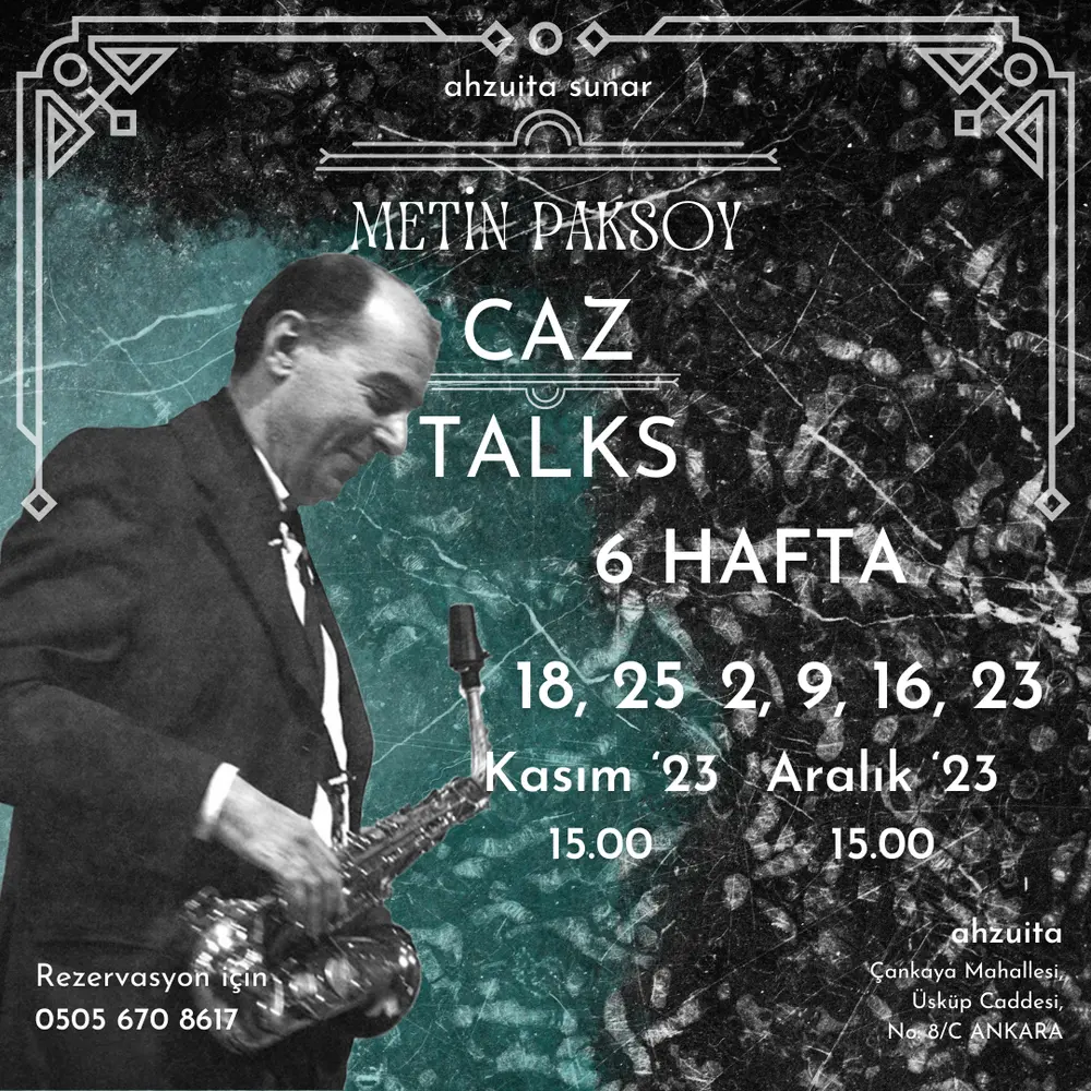 | Etkinlik Konusu | Ahzuita ağırlıklı olarak caz müziğin sergilendiği bir salona sahip. Peki ama nedir bu caz? Nasıl ortaya çıkmış? Bayıla bayıla dinlediğimiz standartların hikayeleri nasıl? Ne kadarını biliyoruz? Tek günle bitmeyecek sorular zincirini 6 haftaya bölüp, caz tarihi konusunda engin bilgilere sahip Metin Paksoy ile dopdolu bir Caz Talks serisi hazırladık. Cazın doğuşuna sebep olan sosyokültürel etkenlerden başlayarak günümüze kadar gelmeyi planlıyoruz. |