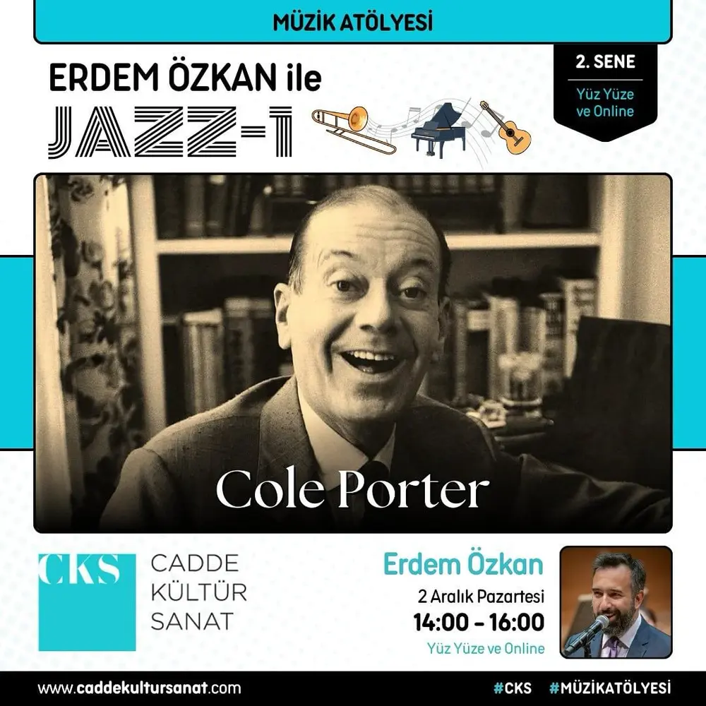 | Etkinlik Konusu | Erdem Özkan ile Yeni Başlayanlar için Caz atölyemizde 2 Aralık Pazartesi günü "Cole Porter" işleyeceğiz. |