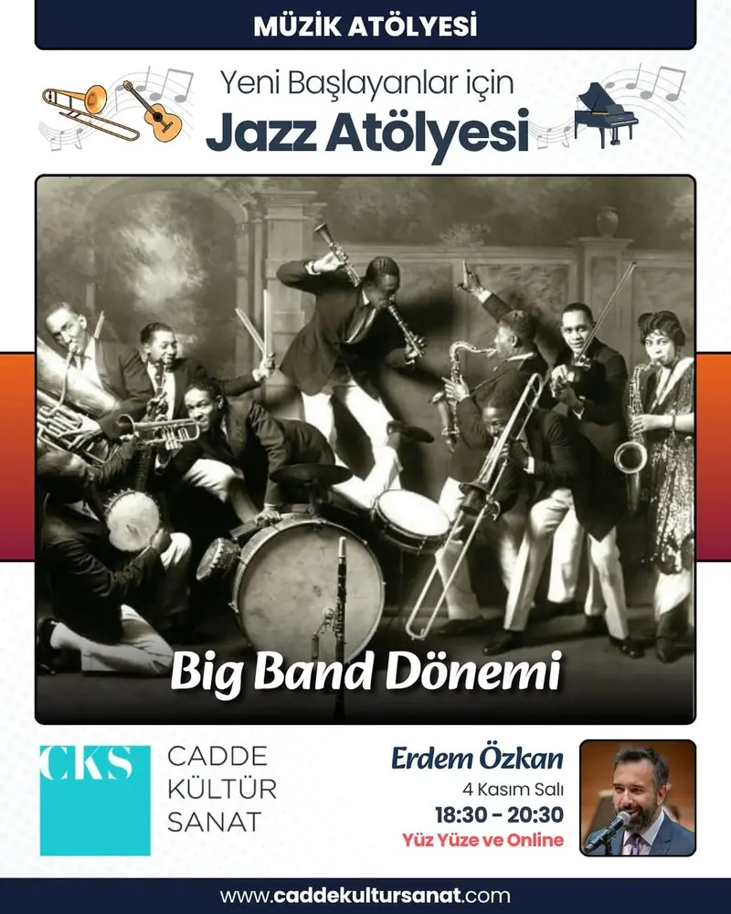 | Etkinlik Konusu | Erdem Özkan ile Yeni Başlayanlar için Caz atölyemiz 4 Kasım Salı günü Big Band dönemine girişi işleyeceğiz. Her Salı 18:30-20:30 saatleri arasında caz müziği ile dolu yeni bir dünya sizi bekliyor. Kayıtlarımız devam ediyor. Seminerlerimiz yüz yüze ve online olarak gerçekleşmektedir. Tüm atölyelerde kayıt alınmaktadır. |
