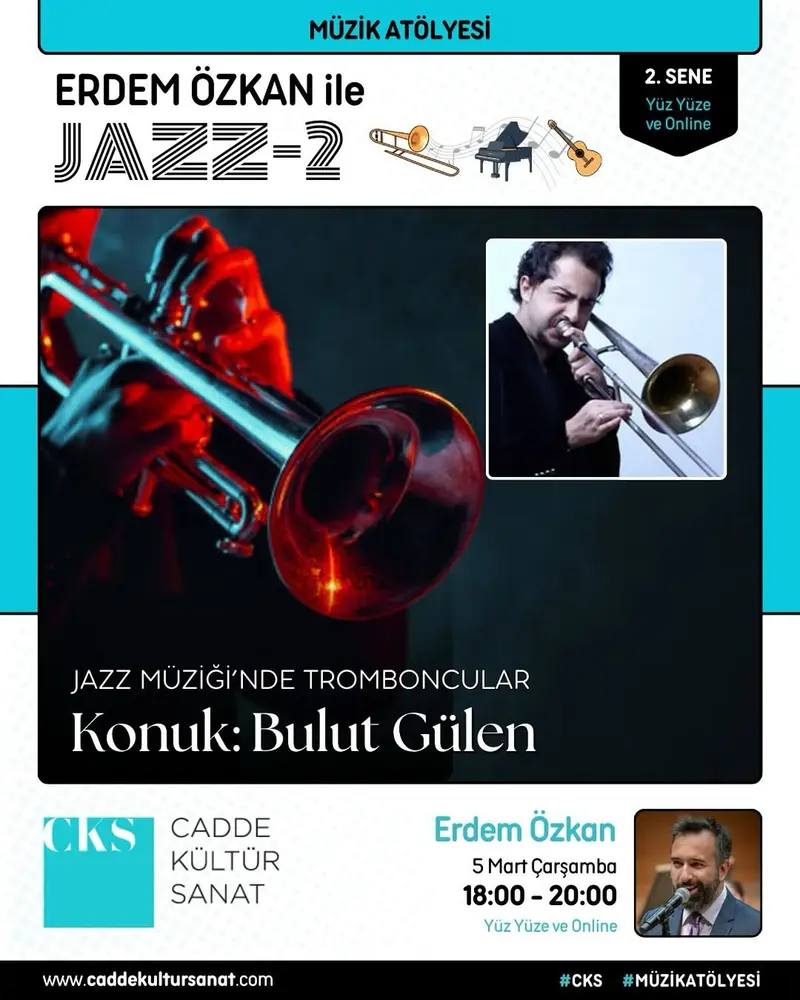Etkinlik Konusu | Erdem Özkan Jazz 2. sene atölyemizde 5 Mart Çarşamba gecesi 18:00-20:00 saatleri arasında Jazz Müziğinde Tromboncular işleyeceğiz ve Bulut Gülen konuk sanatçımız olacak. Caz müziği ile ilgilenip, belli bir seviye üstünde bilgisi olan yeni katılımcıları da bekliyoruz. |