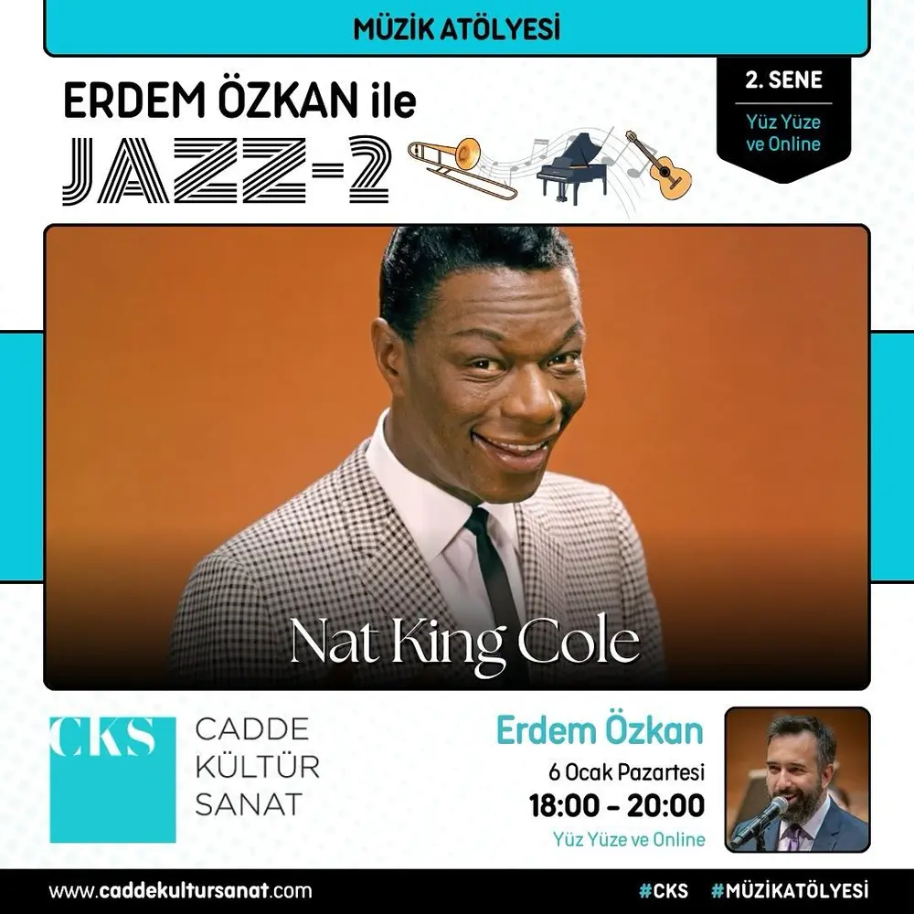 Etkinlik Konusu | Erdem Özkan Jazz 2. sene atölyemizde 6 Ocak Pazartesi 18:00-20:00 saatleri arasında "Nat King Cole" işleyeceğiz. Caz müziği ile ilgilenip, belli bir seviye üstünde bilgisi olan yeni katılımcıları da bekliyoruz. |