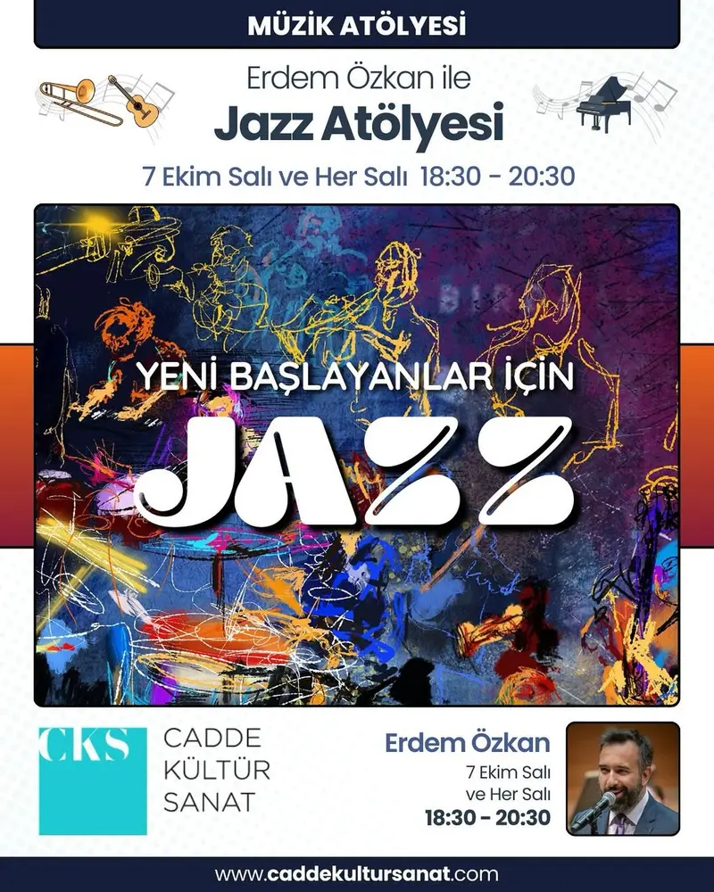 | Etkinlik Konusu | Erdem Özkan ile Yeni Başlayanlar için Caz atölyemiz 7 Ekim Salı günü başlıyor. Her Salı 18:30-20:30 saatleri arasında caz müziği ile dolu yeni bir dünya sizi bekliyor. Kayıtlarımız devam ediyor. Seminerlerimiz yüz yüze ve online olarak gerçekleşmektedir. Tüm atölyelerde kayıt alınmaktadır. |