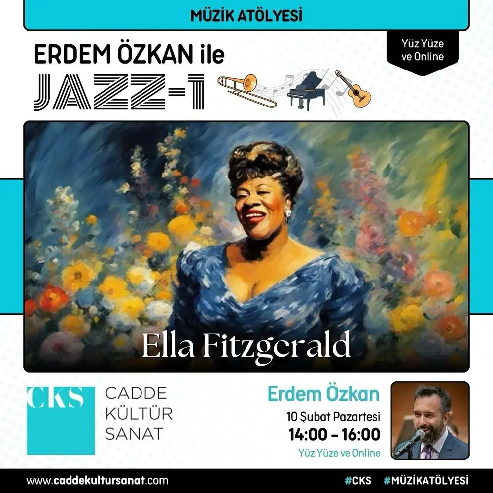 Etkinlik Konusu | Erdem Özkan ile Yeni Başlayanlar için Caz atölyemizde 10 Şubat Pazartesi günü "Ella Fitzgerald"ı işleyeceğiz. Her Pazartesi 14:00-16:00 saatleri arasında caz müziği ile dolu yeni bir dünya sizi bekliyor. Kayıtlarımız devam ediyor. Seminerlerimiz yüz yüze ve online olarak gerçekleşmektedir. Tüm atölyelerde kayıt alınmaktadır. |