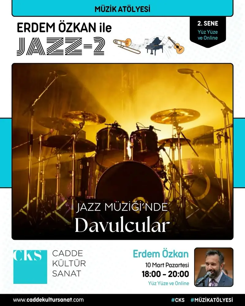 Etkinlik Konusu | Erdem Özkan Jazz 2. sene atölyemizde 10 Mart Pazartesi 18:00-20:00 saatleri arasında caz müziğinde davulcular konusunu işleyeceğiz. Caz müziği ile ilgilenip, belli bir seviye üstünde bilgisi olan yeni katılımcıları da bekliyoruz. |