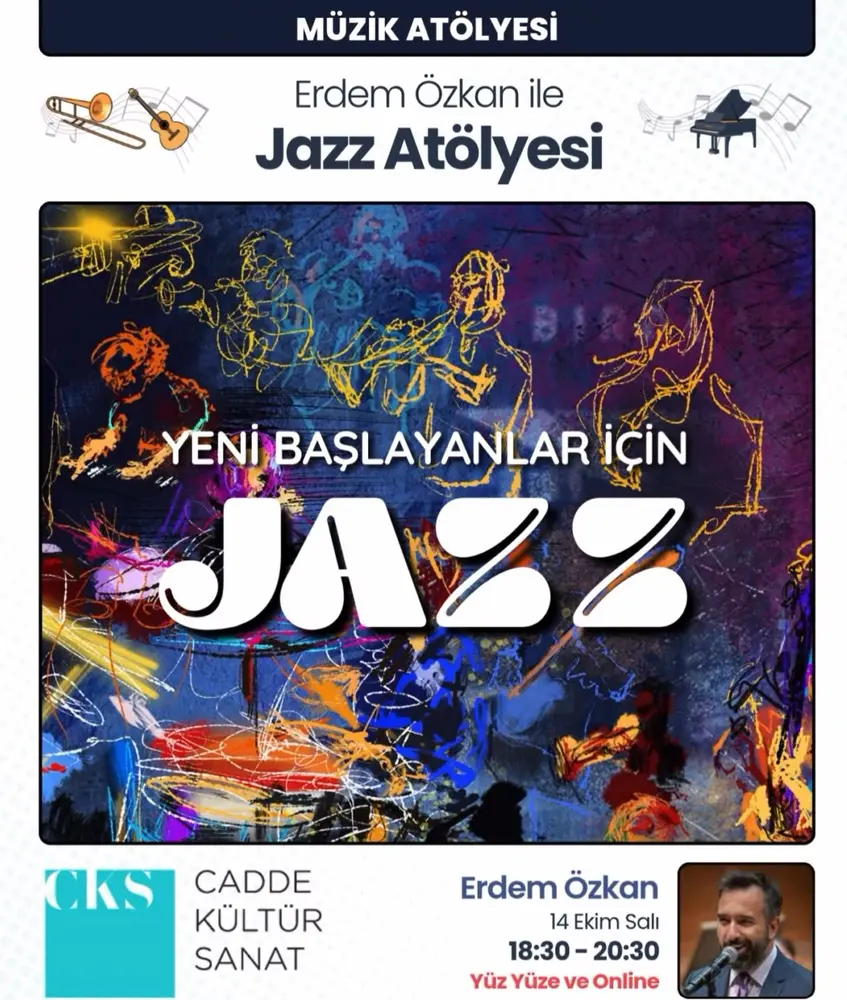 | Etkinlik Konusu | Erdem Özkan ile Yeni Başlayanlar için Caz atölyemiz 14 Ekim Salı günü. Her Salı 18:30-20:30 saatleri arasında caz müziği ile dolu yeni bir dünya sizi bekliyor. Kayıtlarımız devam ediyor. Seminerlerimiz yüz yüze ve online olarak gerçekleşmektedir. Tüm atölyelerde kayıt alınmaktadır. |