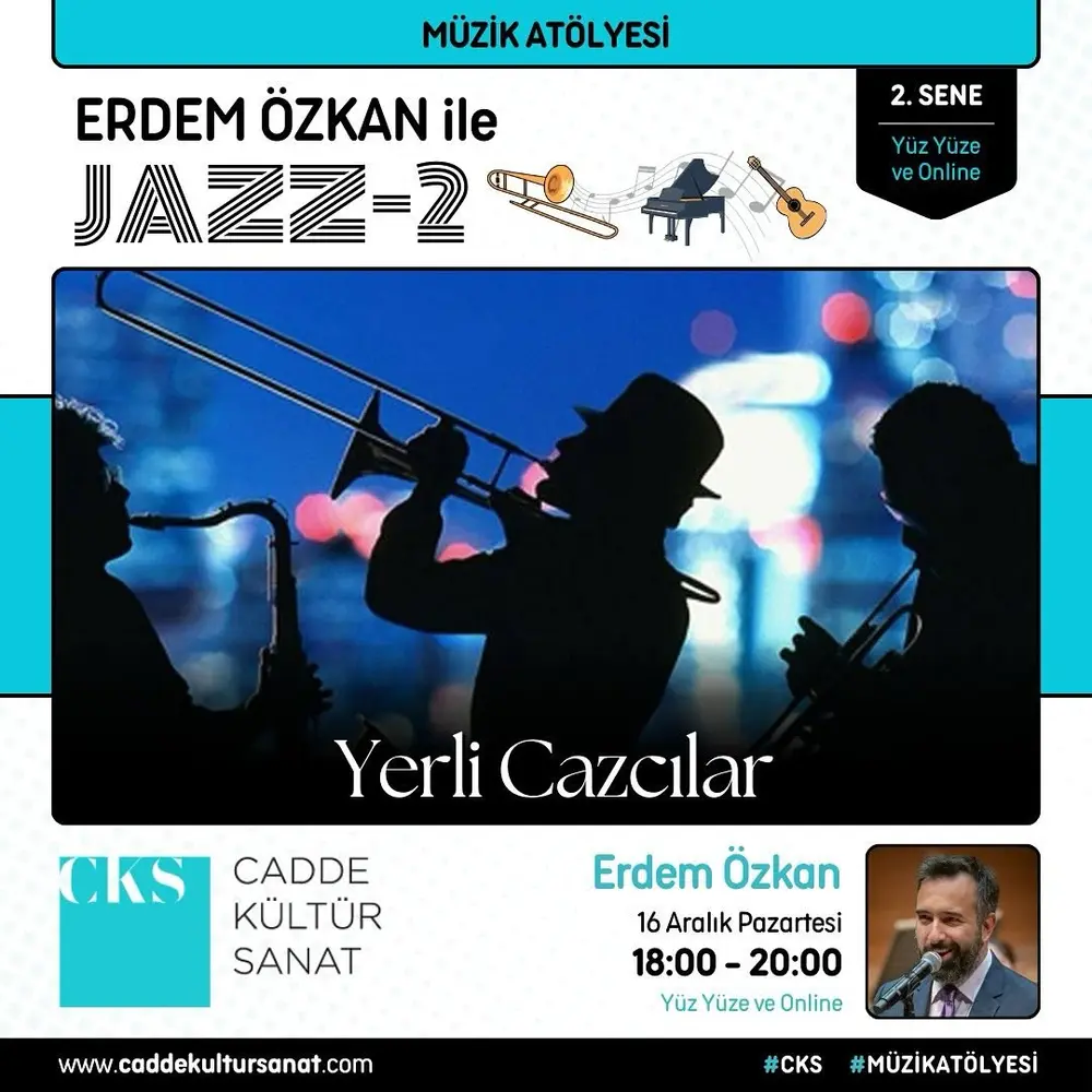 | Etkinlik Konusu | Erdem Özkan Jazz 2. sene atölyemizde 16 Aralık Pazartesi 18:00-20:00 saatleri arasında "Yerli Cazcılar" konusunu işleyeceğiz. |