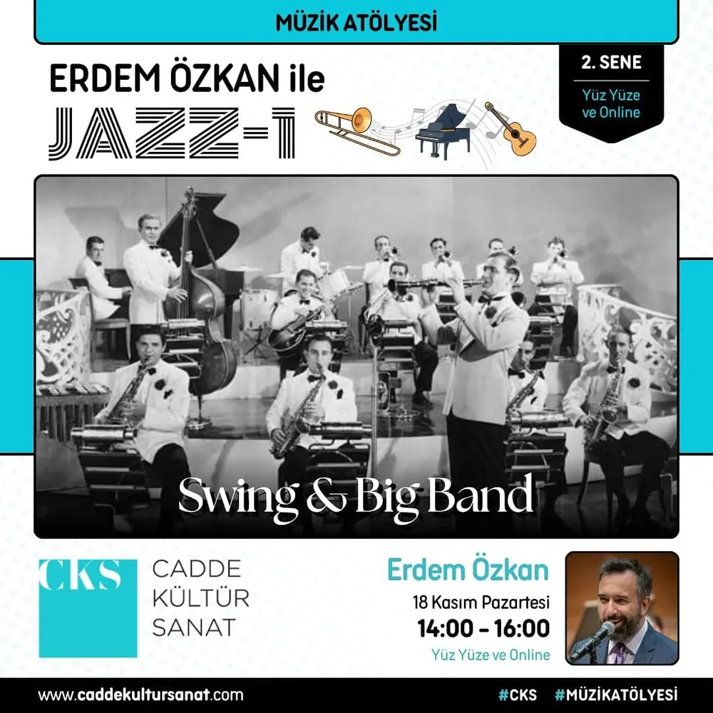 | Etkinlik Konusu | Erdem Özkan ile Yeni Başlayanlar için Caz atölyemizde 18 Kasım Pazartesi günü "Swing & Big Band" konusunu işleyeceğiz. |