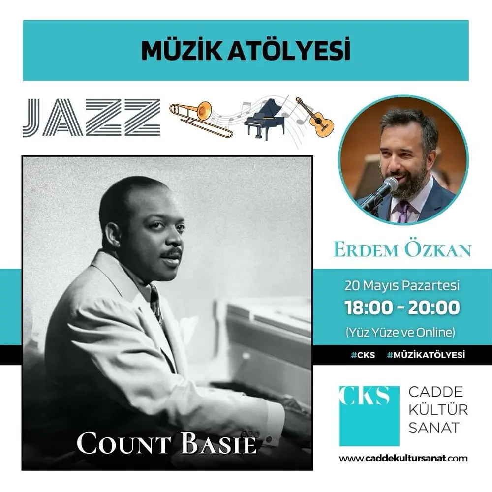 | Etkinlik Konusu | Erdem Özkan ile Caz atölyemizde 20 Mayıs Pazartesi caz sanatçısı Count Basie işleyeceğiz. |