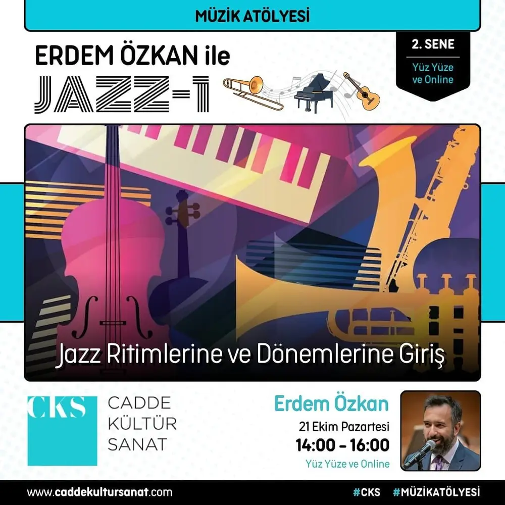 | Etkinlik Konusu | Erdem Özkan ile Yeni Başlayanlar için Caz atölyemizde 21 Ekim Pazartesi günü caz ritimlerine ve dönemlerine giriş konusunu işleyeceğiz. |