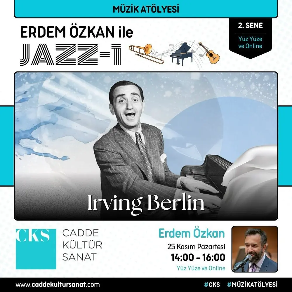 | Etkinlik Konusu | Erdem Özkan ile Yeni Başlayanlar için Caz atölyemizde 25 Kasım Pazartesi günü "Irving Berlin" işleyeceğiz. |