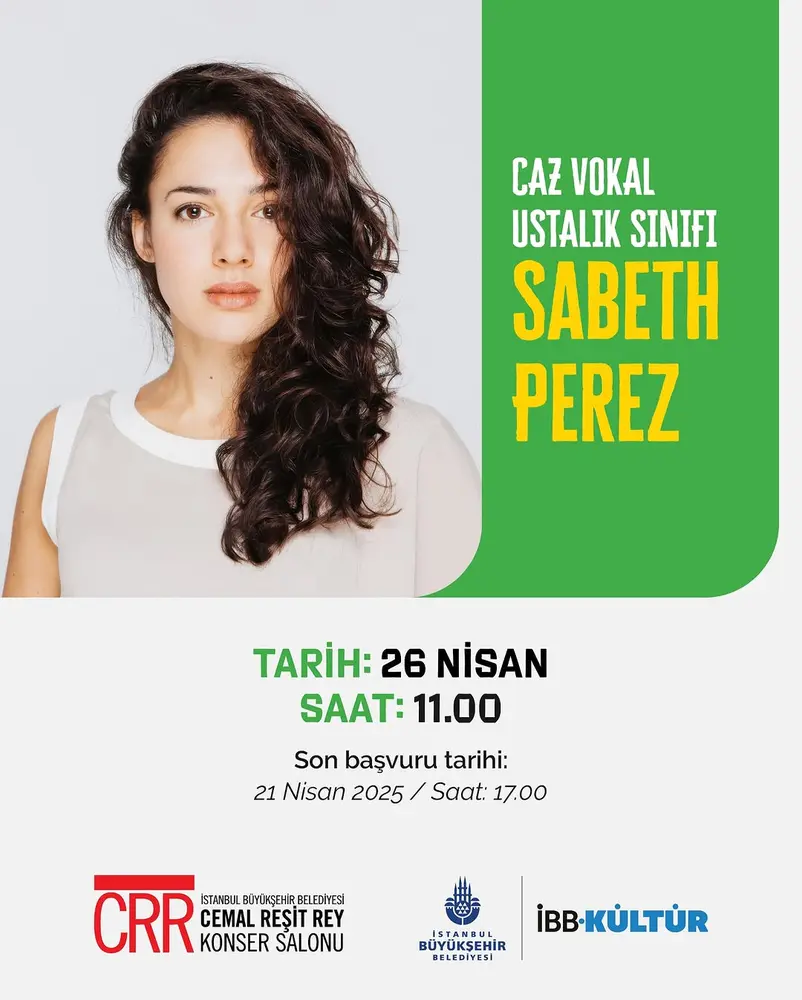 Etkinlik Konusu | CRR Ustalık Sınıfı’na bu kez genç caz vokalistlerini bekliyoruz! Avrupa’nın önde gelen caz orkestralarıyla konserler veren, New York sahnesinin dikkat çeken vokalistlerinden Sabeth Perez, deneyimlerini İstanbullu genç müzisyenlerle paylaşacak. |