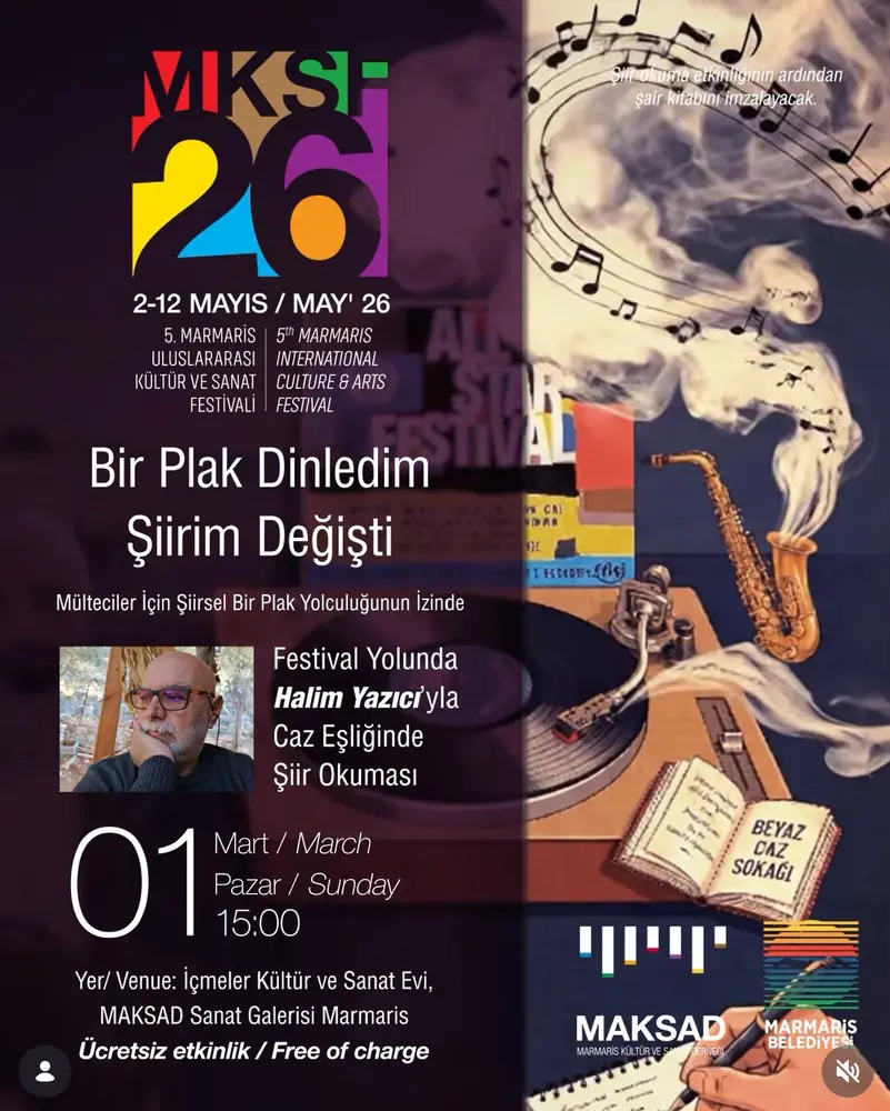 MKSF2026 kapsamında, Festival Yolunda Halim Yazıcı’yla Caz Eşliğinde Şiir Okuma etkinliğine davetlisiniz. “Bir Plak Dinledim Şiirim Değişti” başlıklı bu özel buluşmada şair Halim Yazıcı; Louis Armstrong, Ella Fitzgerald, Nana Mouskouri, Edith Piaf ve Maurice Chevalier gibi efsane isimlerin yer aldığı “All Star Festival” adlı özel plak eşliğinde, “Beyaz Caz Sokağı” kitabında caz sanatçılarına ve müzisyenlere adadığı şiirlerini seslendirecek. Müzik ve şiir dolu bir pazar gününde MAKSAD İçmeler Sanat Galerisi’nde buluşmak üzere. |