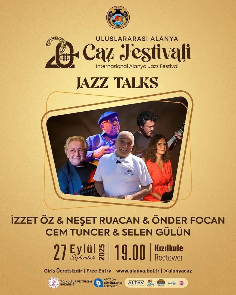 Etkinlik Konusu | Alanya Uluslararası Caz Festivalimizde 20. yıla özel bir ilk daha! Cazın ve müziğin konuşulacağı ‘JAZZ TALKS’ ülkemizin en önemli prodüktörlerinden olan festivalimizin onur konuğu İzzet Öz moderatörlüğünde Kızılkule’nün eşsiz manzarası eşliğinde gerçekleşecek. Usta isimler Neşet Ruacan, Önder Focan, Cem Tuncer ve Selen Gülün’ün yer alacağı Jazz Talks 27 Eylül Cumartesi günü saat 19:00’da… |