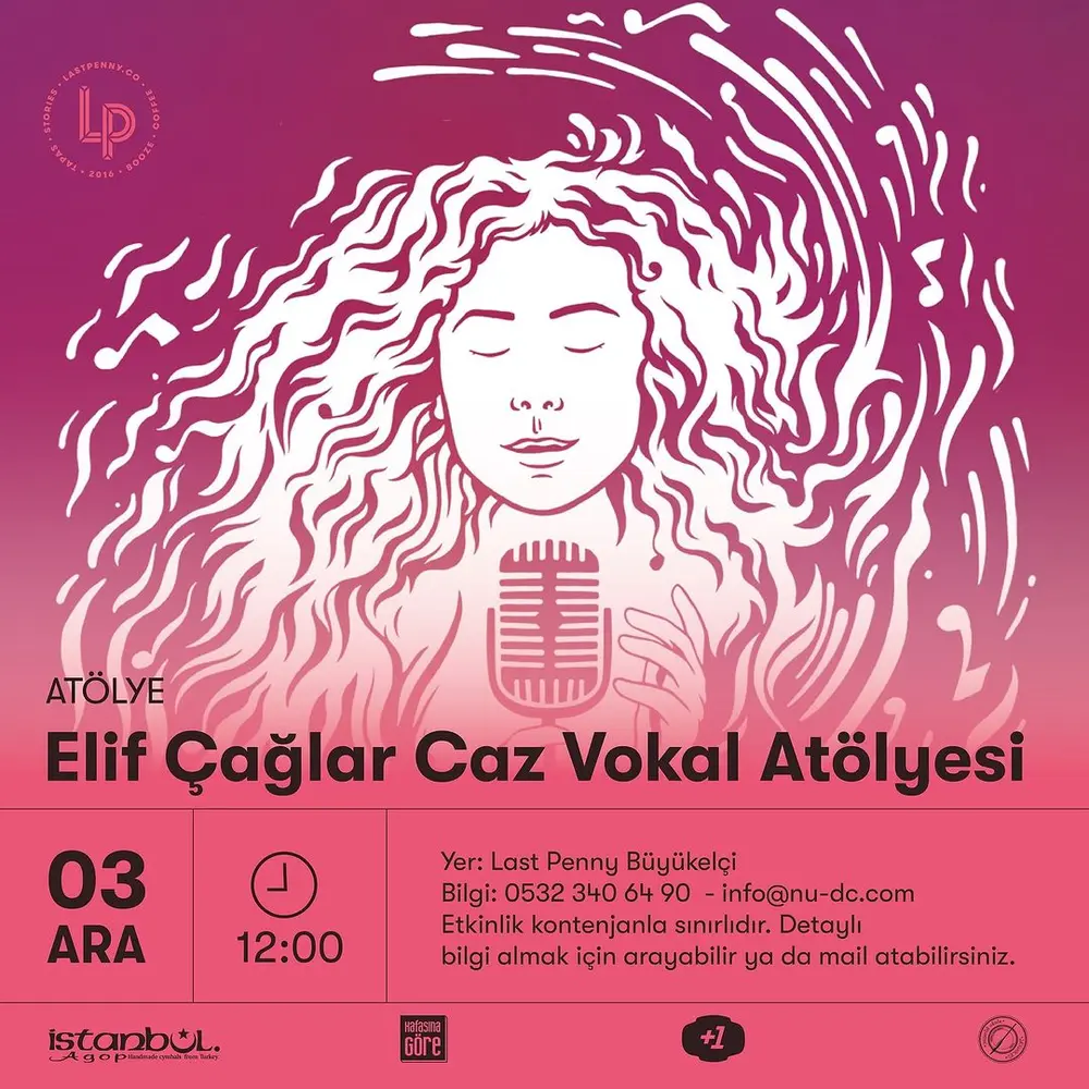 Etkinlik Konusu Bu vokal atölyesinde, cazın temel prensipi olan doğaçlamaya her tarza uygulayabileceğiniz egzersizlerle giriş, cazdan soul’a parça yorumlama, özgünleştirme ve sesin renklerini kullanma gibi teknik bazı konulara değinilecek. Her ay farklı egzersizler ve konularla farklılaşacak atölye, şarkı söyleme yeteneğini geliştirmek için adım atmak isteyen herkese açıktır, nota bilgisi şart değildir. 4 saat süren yoğun müfredat, müzik, sohbet, kahve ve leziz atıştırmalıklar eşliğinde keyifli bir öğleye davetlisiniz.Not: Bu atölye kontenjanla sınırlıdır.