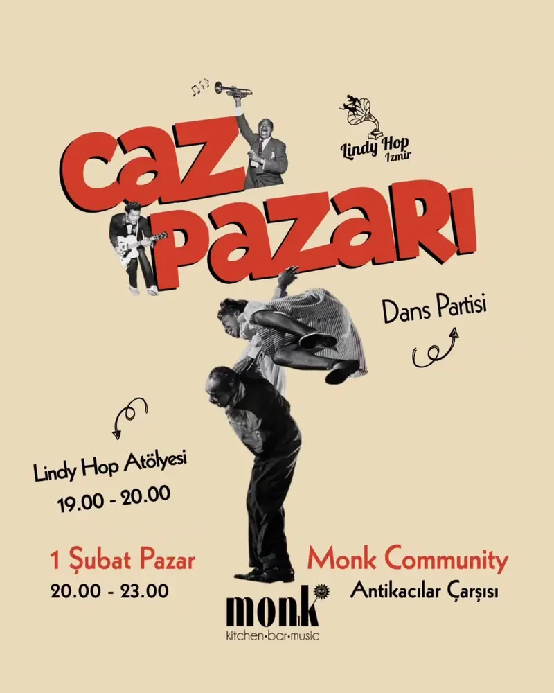 | Etkinlik Konusu | Her pazar “Caz Pazarı” etkinliğimizle Monk’ta buluşuyoruz. Parti öncesi başlangıç seviye derslerini tamamlamış tüm dansçılar için Mert ve Zühre'nin hazırlamış olduğu atölyemiz ücretsizdir. |