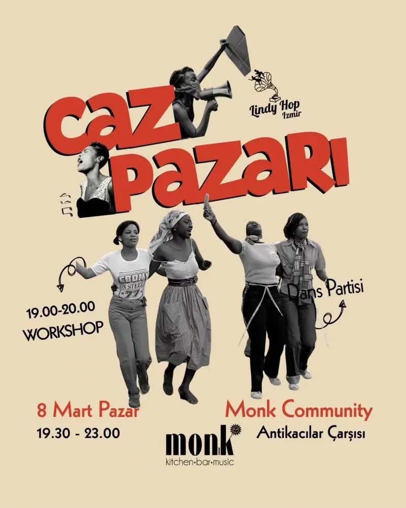 | Etkinlik Konusu | Her pazar “Caz Pazarı” etkinliğimizle Monk’ta buluşuyoruz. Parti öncesi başlangıç seviye derslerini tamamlamış tüm dansçılar için Nil & Emre'nin hazırlamış olduğu atölyemiz ücretsizdir. |