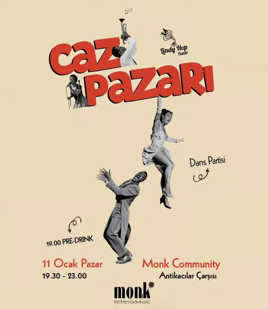 | Etkinlik Konusu | Her pazar “Caz Pazarı” etkinliğimizle Monk’ta buluşuyoruz. Parti öncesi, pre-drink konsepti ile sohbet ve komunite ile kaynaşma elbette. |
