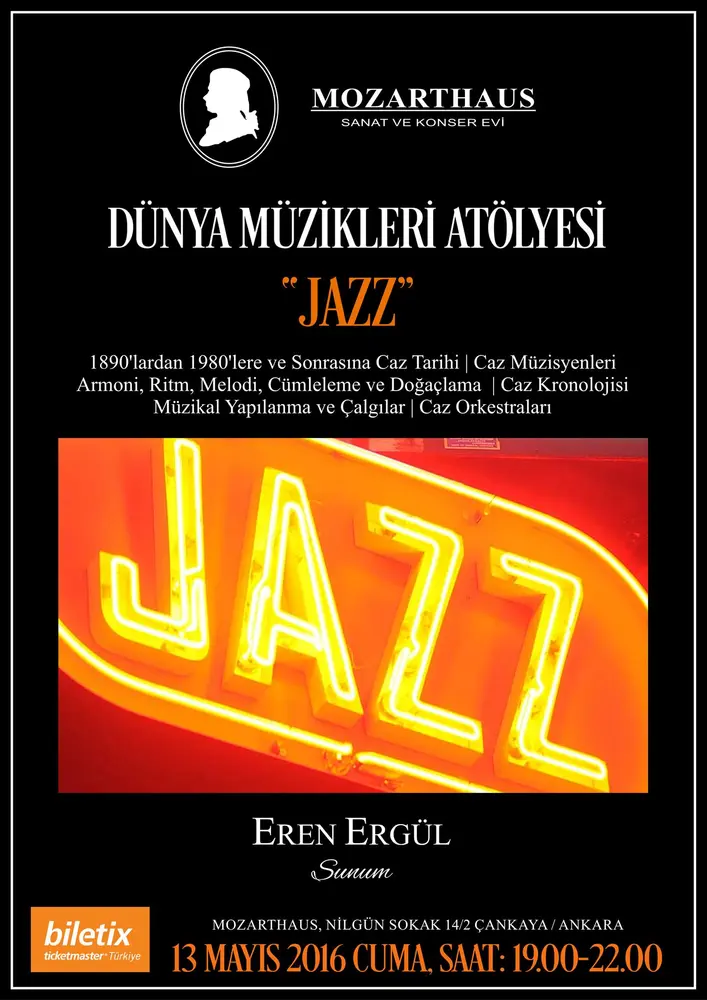 | Etkinlik Konusu | 1890'lardan 1980'lere ve sonrasına Caz Tarihi | Bir kültür olarak Caz | Caz Kronolojisi | Caz Müzisyenleri | Armoni, Ritim, Melodi, Cümleleme ve Doğaçlama | Müzikal Yapılanma ve Çalgılar | Caz Orkestraları |