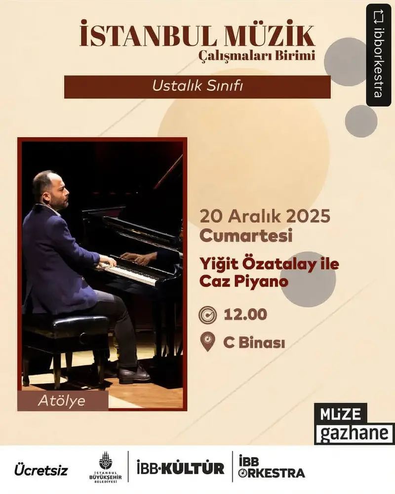 Etkinlik Müze Gazhane’de ücretsiz olarak gerçekleşecek. Başvuru hakkında ayrıntılı bilgiye profildeki bağlantıdan erişilebilir. İstanbul Müzik Çalışmaları Birimi, çağdaş caz sahnesinin özgün yorumcularından Yiğit Özatalay’ı ağırlıyor. Bu ustalık sınıfında; caz piyano tekniği, doğaçlama yaklaşımı, armonik düşünme biçimleri ve repertuar oluşturma süreçleri üzerine uygulamalı bir çalışma yapılacak. Katılımcılar, Özatalay’ın deneyimlerinden ve müzikal yaklaşımından birebir faydalanma fırsatı bulacak. Caz piyanoda derinleşmek isteyen tüm müzisyenlere açık bir eğitim. Son başvuru tarihi: 18 Aralık 2025, 23:59. Etkinlik ücretsizdir; kontenjan sınırlıdır. Başvurular değerlendirme sonucu katılımcılara e-posta yoluyla bildirilecektir. Başvuru için: https://forms.ibb.gov.tr/kultur/caz-piyano-ustalik-sinifi-yigit-ozatalay |
