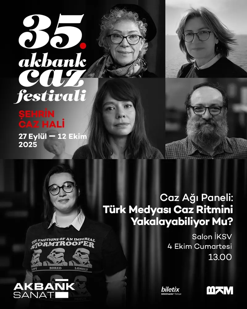 Türk Medyası Caz Ritmini Yakalayabiliyor mu?: Türkiye’de Cazın Medyası ve İletişimi konulu bu panelde Türkiye'de caz ve doğaçlama müzik basın ve medya organizasyonlarında nasıl ve ne derece yer almış gibi sorulara cevaplar aranacak. Farklı arka planlardan gelen katılımcılarla birlikte bu panelde Türkiye'de caz alanında müzik yazarlığı ne derece gelişmiş, caz basın iletişimi çok yaygın mı, değilse neden değil gibi birçok soru üzerinden sohbet edilecek. Medyaya farklı sesler ve bakış açıları getiren katılımcıların şekillendireceği panel, 35. Akbank Caz Festivali kapsamında 4 Ekim’de Salon İKSV’de gerçekleşecek. Moderatör: Ece Ulusum (Back on Stage Kurucusu). Panelistler: Zuhal Focan (Jazz Dergisi Genel Yayın Yönetmeni), Leyla Diana Gücük (Cazkolik Radyo Programcısı ve Müzik Araştırmacısı), Seden Mestan (Dadanizm Kurucu Yayın Yönetmeni), Feridun Ertaşkan (Cazkolik Editörü) |