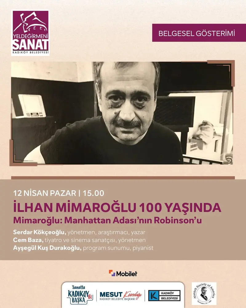 İlhan Mimaroğlu 100 Yaşında! “Geldim, Gördüm, Geçtim, Gittim”. Film ve Tiyatro Gösterimi (15.00–17.30) Etkinliğin ikinci gününde, Serdar Kökçeoğlu’nun ödüllü belgeseli Mimaroğlu: Manhattan Adası’nın Robinson’u izleyiciyle buluşuyor. Belgesel, Mimaroğlu’nun yaşamını, müziğini ve eşi Güngör Mimaroğlu ile kurduğu yaratıcı ortaklığı ele alırken; film içinde yer alan arşiv görüntüleri bizzat Mimaroğlu’nun kamerasından aktarılıyor.Gösterimin ardından, usta tiyatro sanatçısı Cem Baza, Mimaroğlu’nun özgün ve aykırı metinlerinden seçkileri sahneye taşıyor. Program, sanatçının 100. doğum yılında, onun düşünsel ve sanatsal mirasını gelecek kuşaklara emanet etme vurgusuyla tamamlanıyor. Program Komitesi: Serra Akkaya, Hilmi Bitim, Leyla Diana Gücük, Alper Maral |